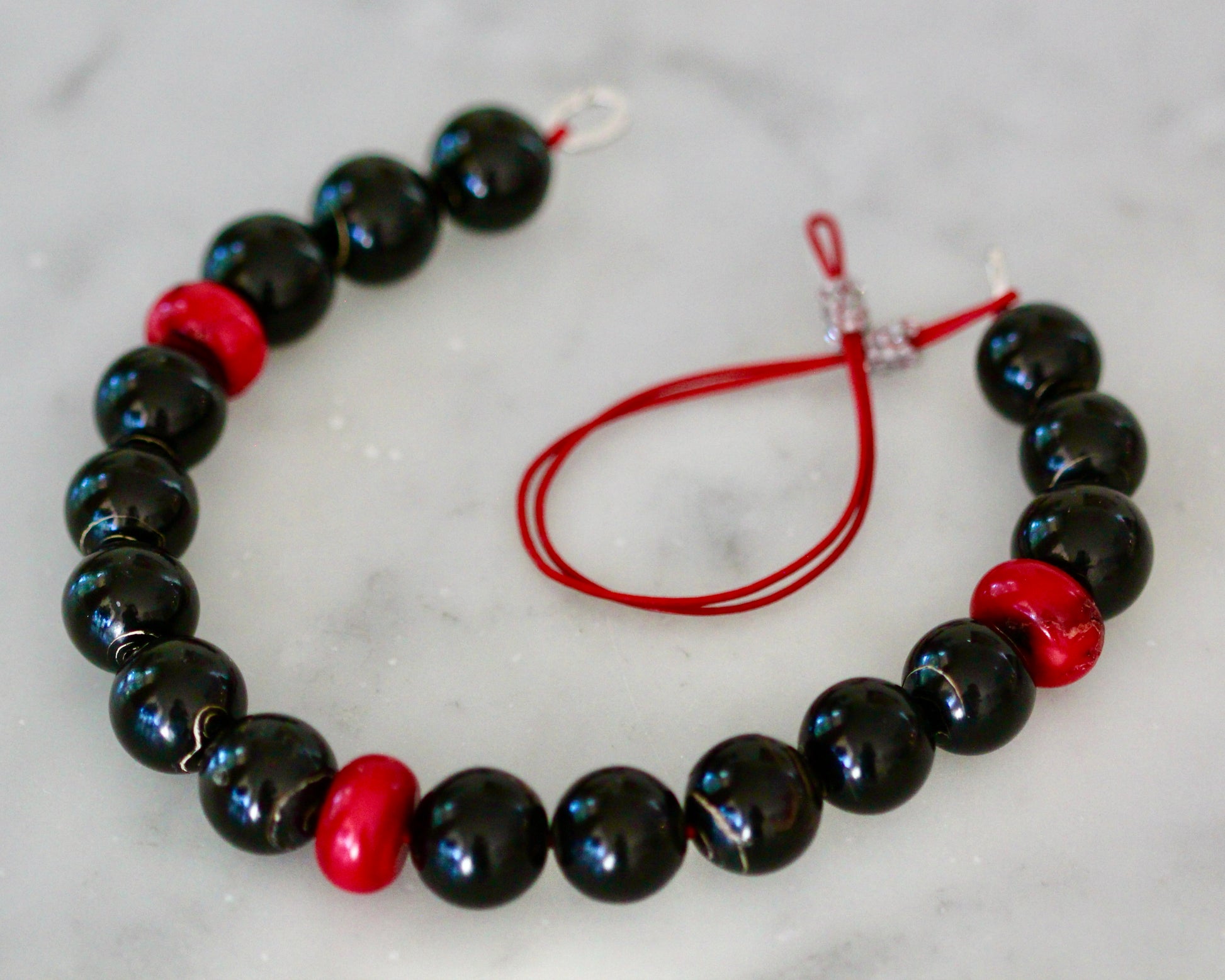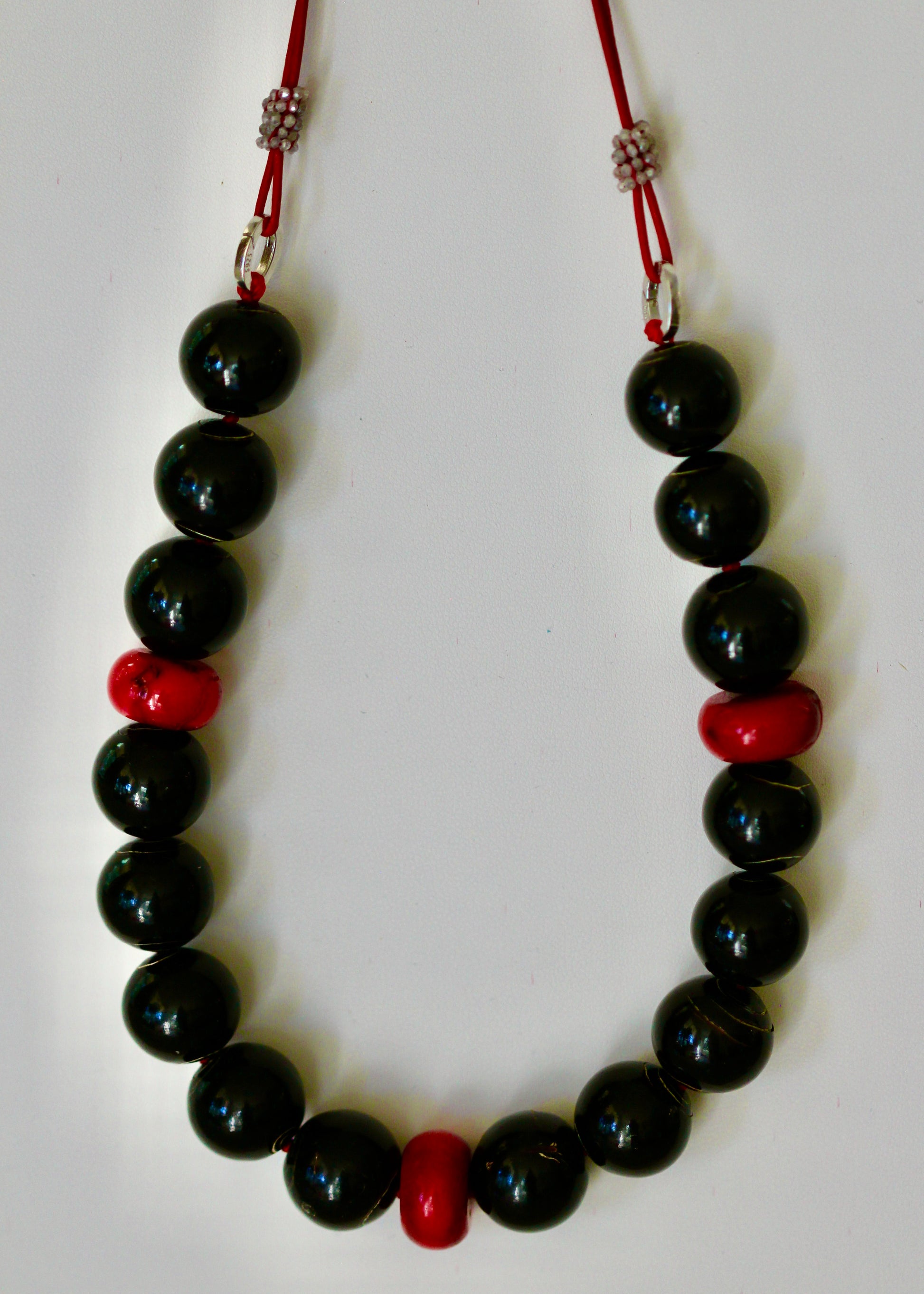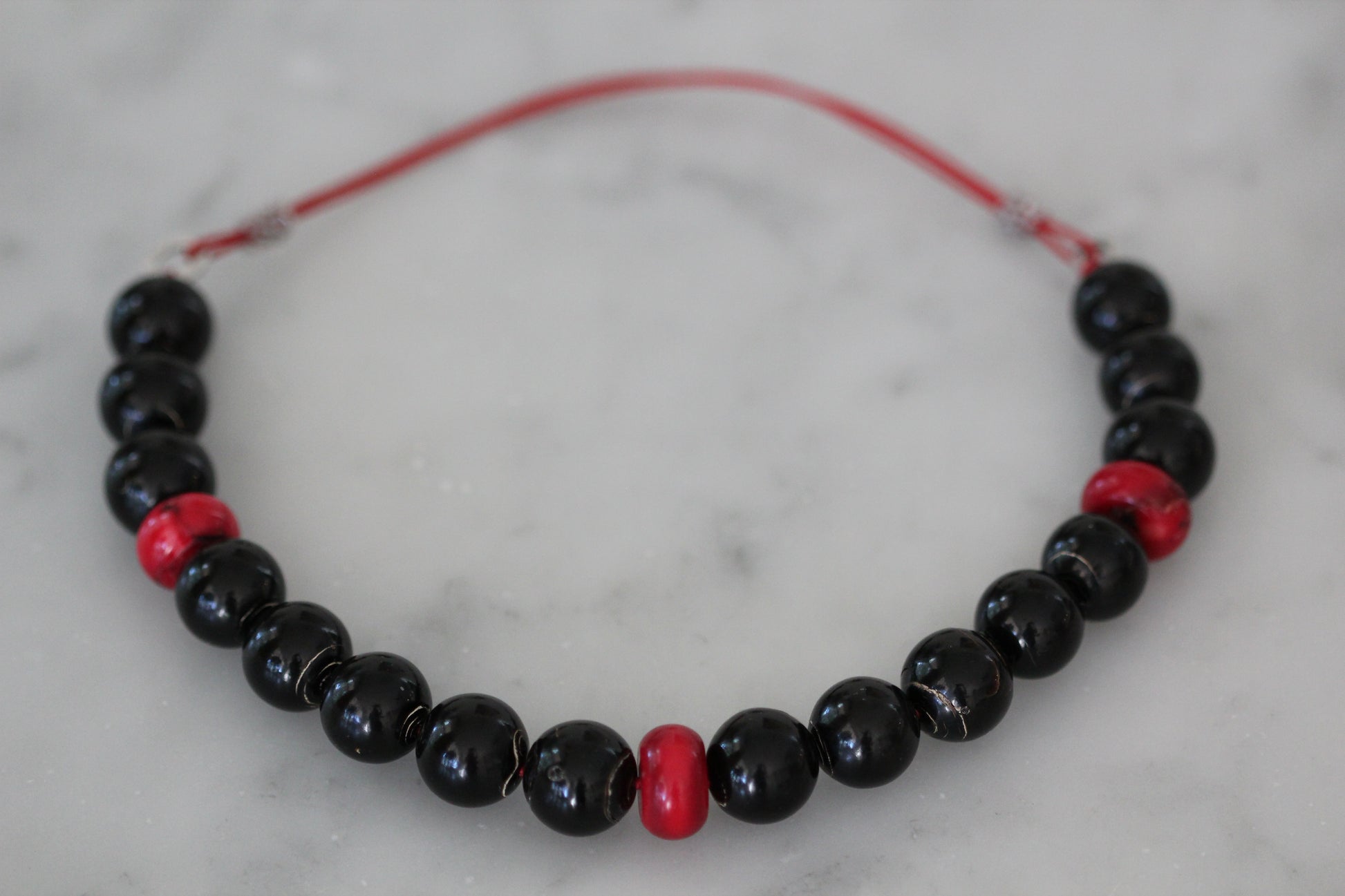 The Spaera Lux Choker Necklace. Sublime Black Coral and Red Coral come together on a 10.5" knotted strand. Connections of Sterling Silver Carabiners attach to a double stand of red leather cord adorned with 2mm faceted grey Diamond beads. One of a kind!